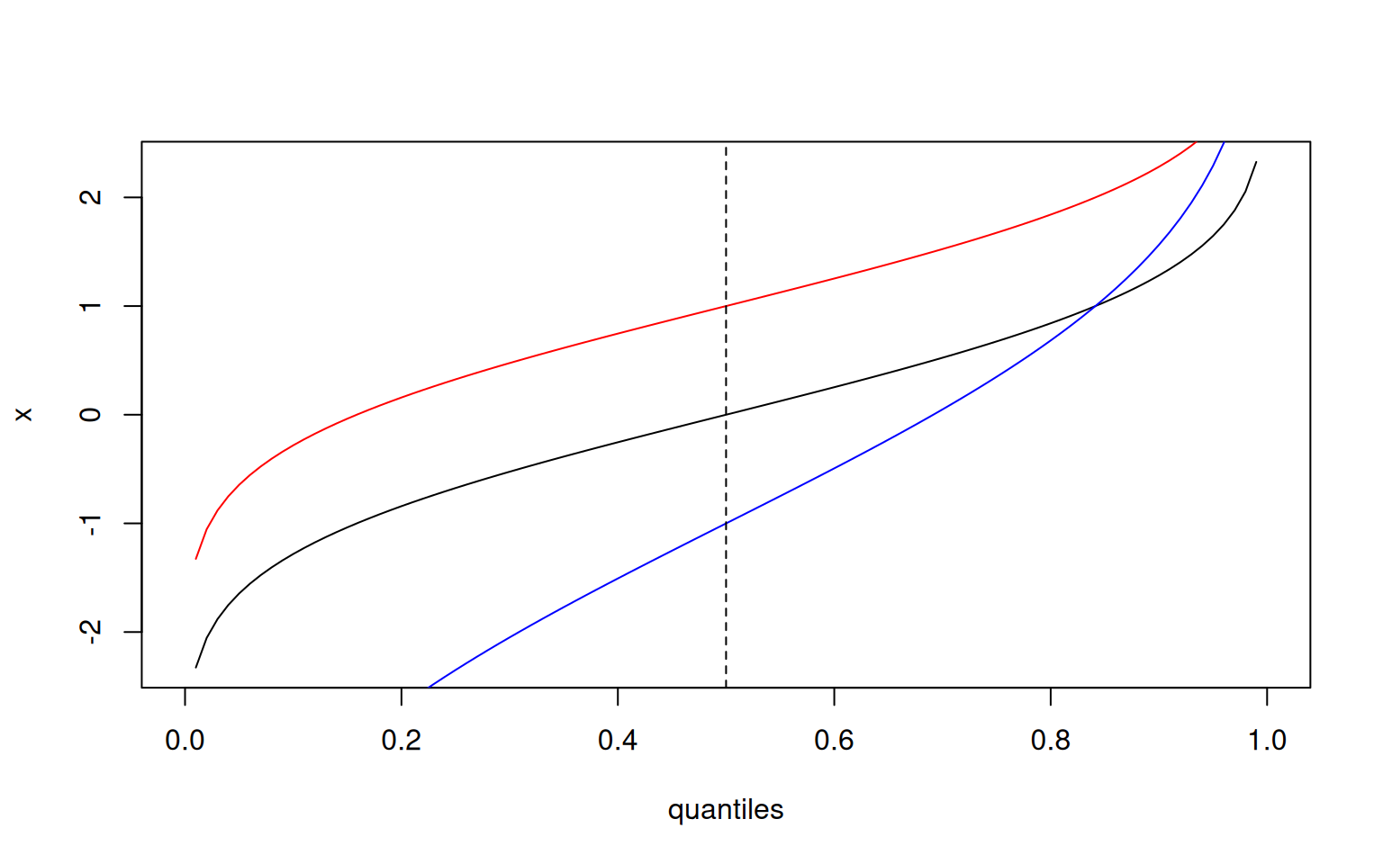 Again, the dashed line at the 50%-quantile intersects the curves exactly at their mean. In fact, this is the same plot as above for pnorm(), except that the x- and y-axis are switched!